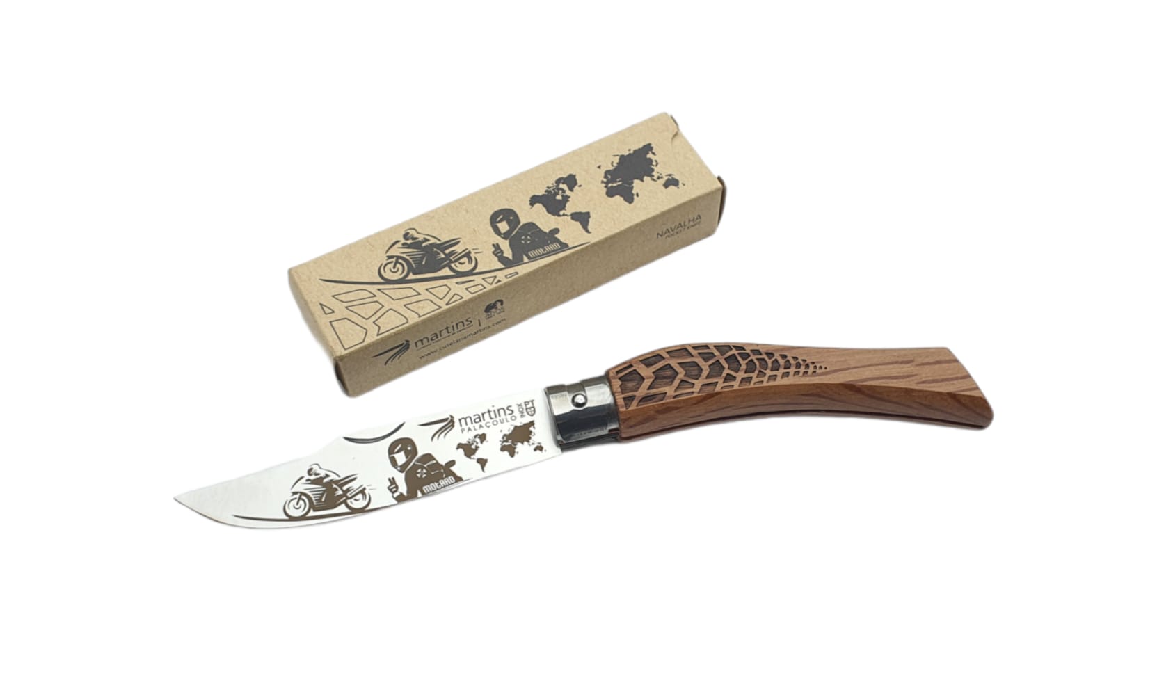Esta peça de uso intensivo, está dotada de uma lâmina em aço inox [420 Mova] e um punho em madeira de carrasco. Dispõem ainda de mecanismo de bloqueio giratório de lâmina, “Giroblock”.